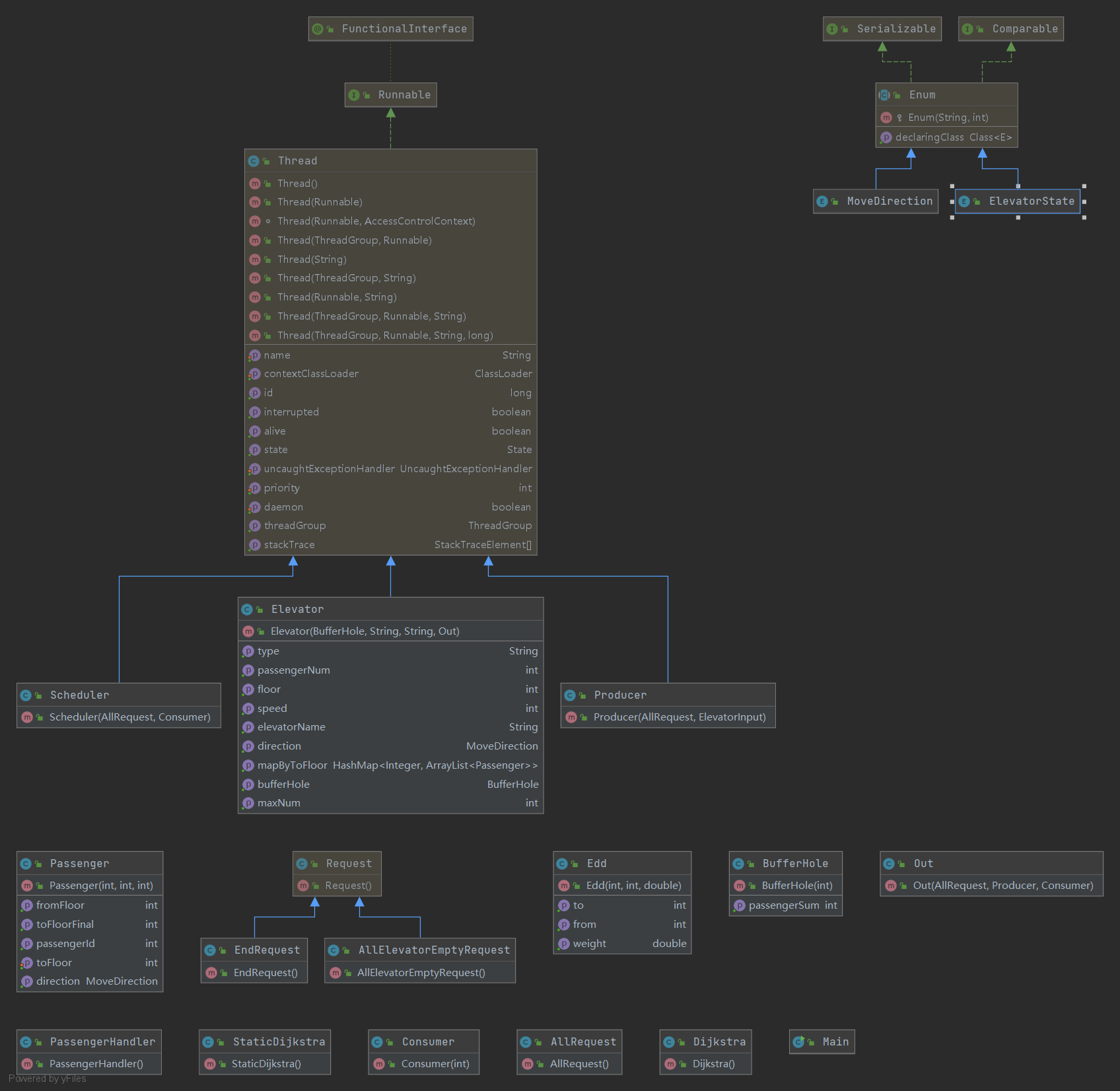 第三次作业设定了电梯的类型,每种类型只能在某些固定的楼层停靠,这表面上只需要改调度算法,但是对我的架构来说,这也引起了新的线程安全问题。