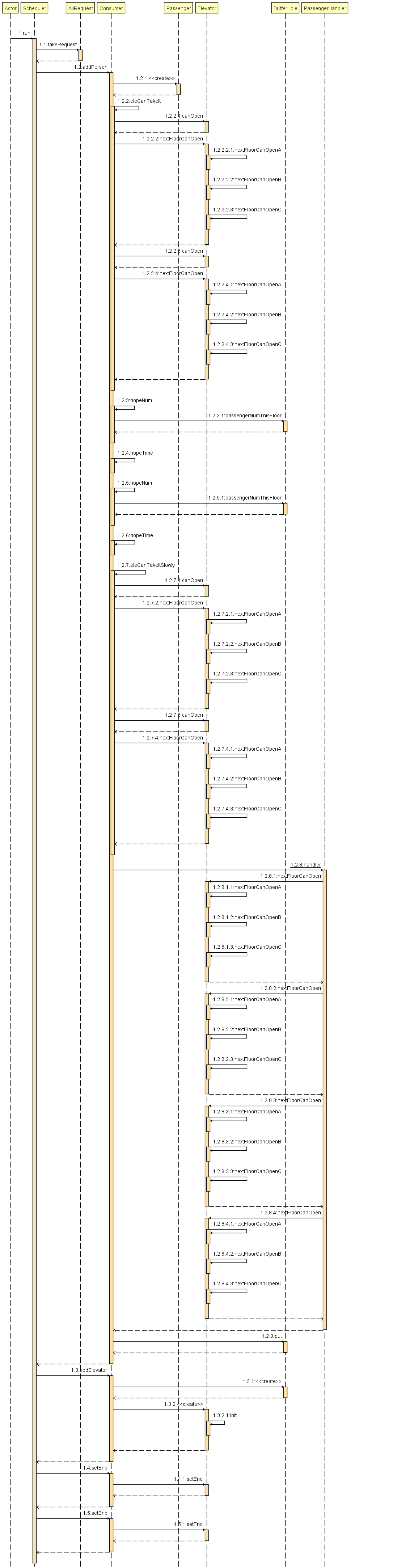调度器采用了一个简单的贪心策略,注意到,如果一个乘客是可以被捎带的那么可以比较快的被送到目的地,那么这个可以捎带是怎么判断的呢,Consumer类中的eleCanTakeIt方法实现了这一判断,判断都有哪些电梯可以捎带,可以稍带也就是说,电梯的运动方向和请求方向相同,并且电梯还没有到达这一请求的出发楼层(如果请求向上,电梯在请求以下的层数),此处本应判断到达这一层的期望人数(即hopeNum大小,计算方法见下文)小于满载人数,但后续经过测试,即使人是满载的,把这个请求放到一部同向的电梯里也是比较优的选择,因此不再判断期望人数,随后从这些可以捎带的电梯中选出到达这一层的时候hopeNum最小的那一部电梯,把当前请求放入那部电梯。