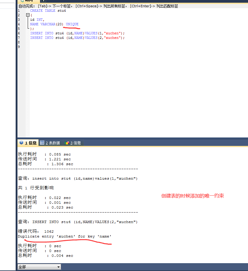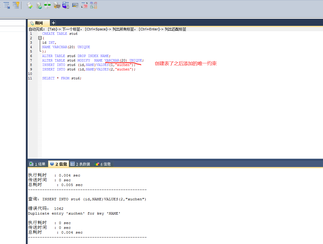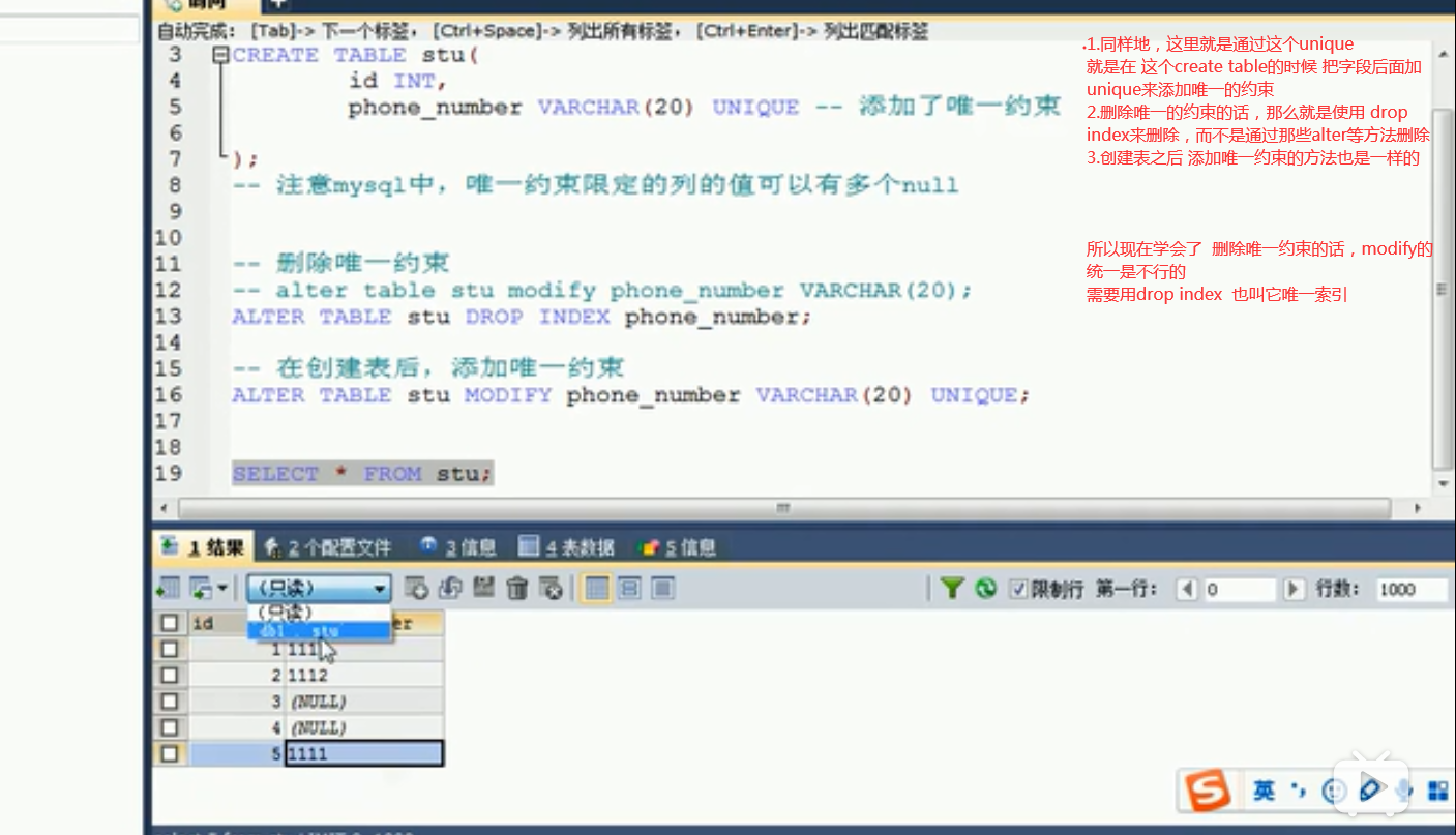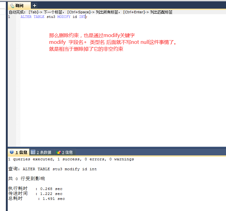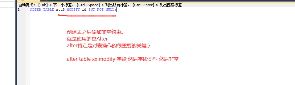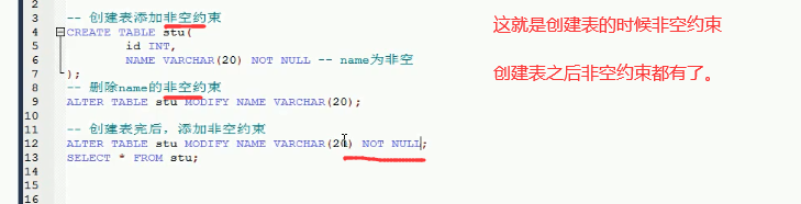ALTER table stu modify id XXX 这里的话是去modify相应的键,但是只有这个not null可以这么改 连唯一都不能这么弄。