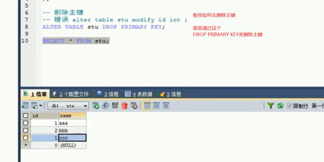ALTER table stu drop primary key 这里不用指定你删除的主键,因为主键一定是唯一的嘛