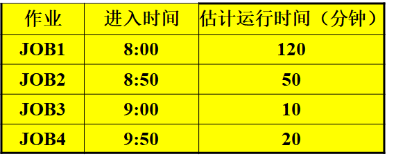 1、假设在单道批处理环境下有四个作业,已知它们进入系统的时间、估计运行时间: