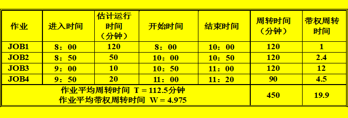 最后是剩下JOB4,开始时间为11:00,估计运行时间20分钟,则结束时间为11:20,周转时间为90分钟,带权周转时间为90/20=4.5