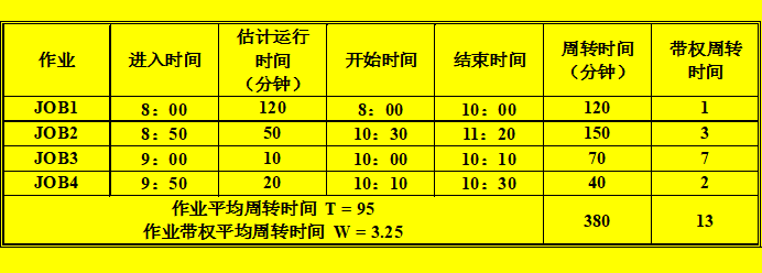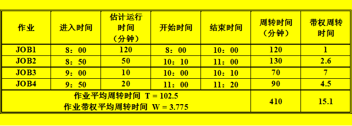 最后剩下是执行JOB2,开始时间为10:30,结束时间为11:20,周转时间为150分钟,带权周转时间为3.
