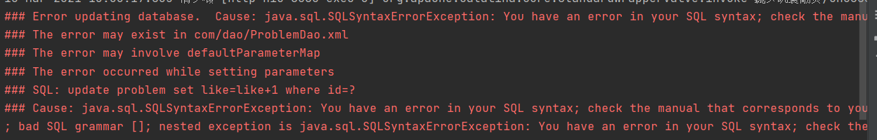 后来发现问题是 like列名是数据库的关键字,所以在写sql语句时要加上esc键下的那个``单引号来对列名进行分割。