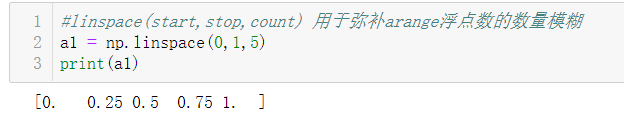 linspace(start, stop, count): 创建一个区间为[start, stop-1]的,元素个数为count的数组,也就是说,系统自己判断各元素的大小