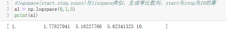 logspace(start, stop, count): 与linspace功能类似,但生成的是等比数列