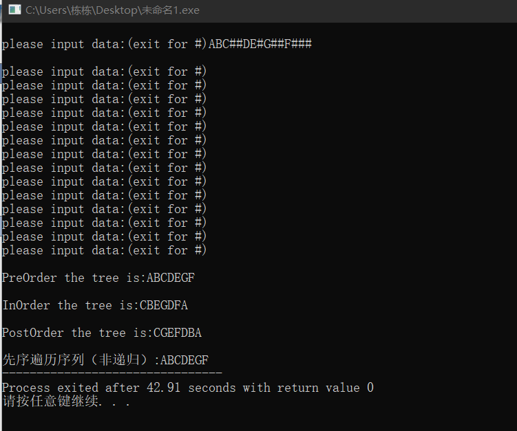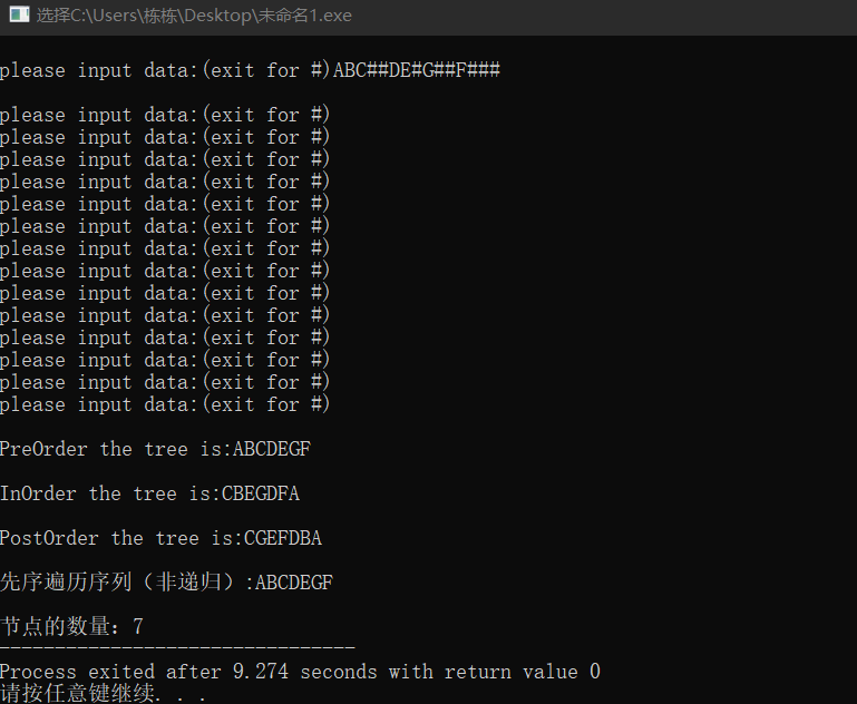 2、在上题中补充求二叉树中求结点总数算法(提示:可在某种遍历过程中统计遍历的结点数),并在主函数中补充相应的调用验证正确性。