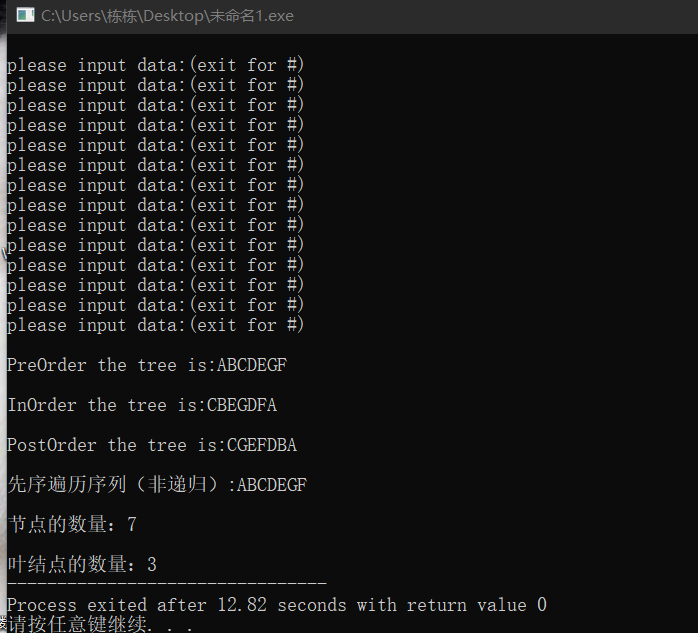 3、在上题中补充求二叉树中求叶子结点总数算法(提示:可在某种遍历过程中统计遍历的叶子结点数),并在主函数中补充相应的调用验证正确性。