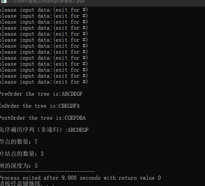 4、在上题中补充求二叉树深度算法,并在主函数中补充相应的调用验证正确性。