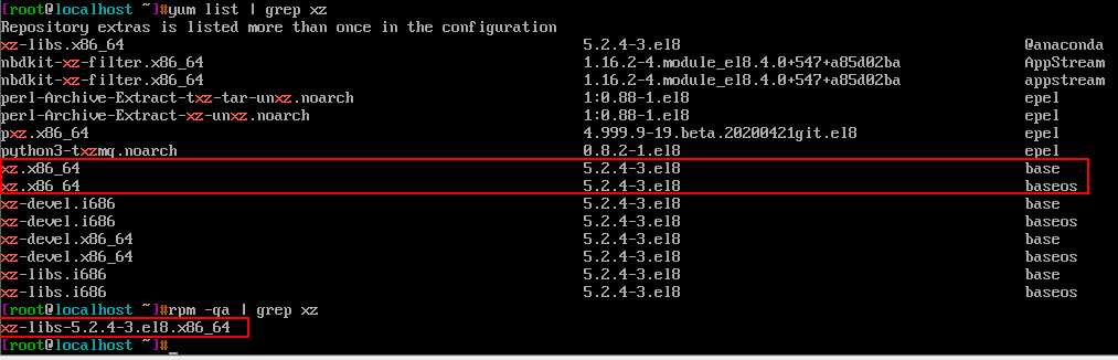 rpm -qa查询系统未安装xz工具,yum list 却显示出现了xz软件包