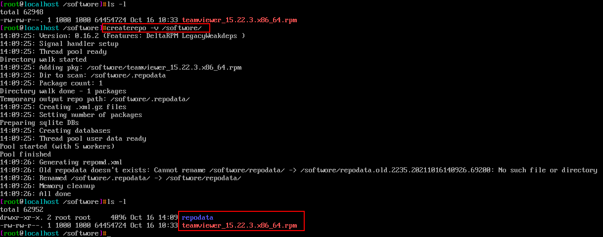createrepo -v /softwore在目录/softwore下建立repodate元数据,同时rpm包只有teamviewer一个,这时候的repodate里面的依赖关系等等仅仅是teamviewer这一个包的依赖关系。