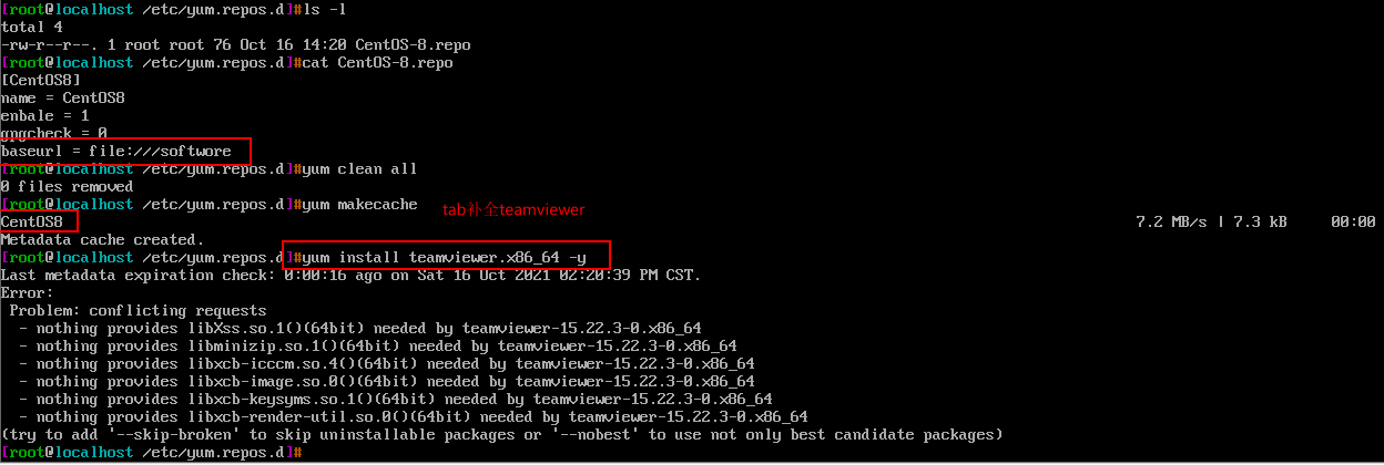 这里就是配置B端的/etc/yum.repos.d/*.repo文件,baseurl指向本地目录/softwore,因为前期在/softwore目下createrepo生成了teamviewer的repodate依赖关系,这里因为yum库(/softwore)缺少相应的teamviewer依赖包,所以这里安装提示缺少依赖包。