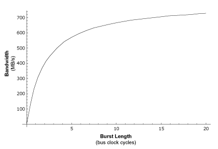 The above graph should make it clear that as burst length increases so does sustained bandwidth. For extremely large burst lengths the sustained bandwidth approaches (but never achieves) the peak theoretical bandwidth.