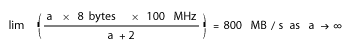 In order to calculate the maximum sustained bandwidth of a system with a four-cycle burst, we must base our calculation on the total number of cycles it takes to transmit all four words of the 4-word cache line. In the system described above, four words (or 4 x 8 = 32 bytes) are transmitted every 6 clock cycles. So on a 100 MHz bus the maximum sustained bandwidth would be 533 MB/s. Here's the calculation written out: