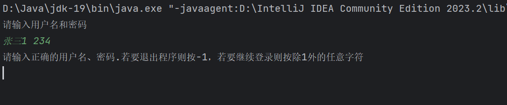 public static void main(String[] args) { boolean flag = false;//是否想要退出,flag等于true则直接退出 // 从文件加载用户信息 List<User> users = loadUsersFromFile(); while (true) { System.out.println("请输入用户名和密码"); Scanner scanner = new Scanner(System.in); String name = scanner.next(); String password = scanner.next(); LoginPage loginPage = new LoginPage(); flag = loginPage.consoleArea(name, password, users);//进入登录页面的操作位置 if (flag == true) {//flag等于true则直接退出 break; } } }