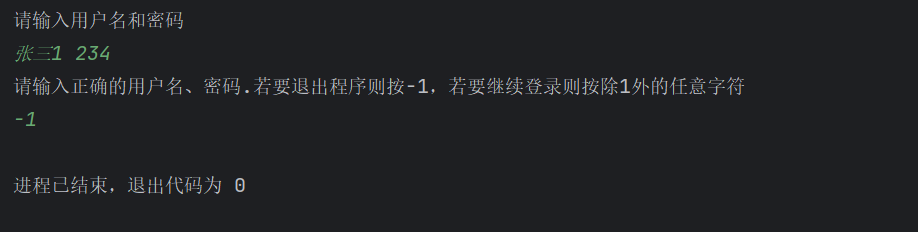 1)这里杨安然同学实现了用户名和密码输入不正确时给予用户退出的功能,避免了用户忘记密码但又无法正常退出程序的尴尬处境,值得学习。
