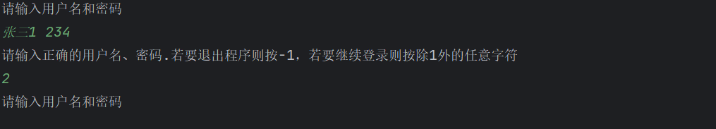 1、运行程序后会显示“请输入用户名和密码”字样,符合项目要求,使用者也能清楚知道要输入的是什么。