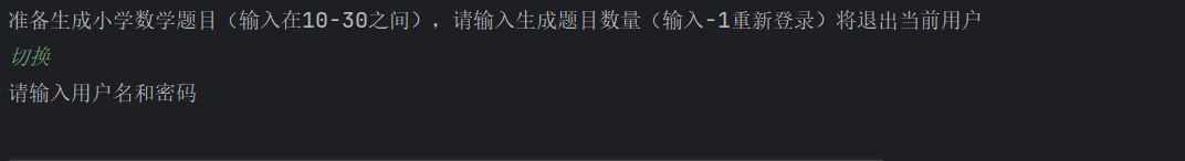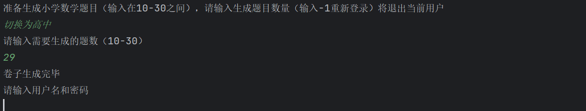 4、在登录状态下,如果用户需要切换类型选项,命令行输入“切换为XX”,XX为小学、初中和高中三个选项中的一个,输入项不符合要求时,程序控制台提示“请输入小学、初中和高中三个选项中的一个”;输入正确后,显示“”系统提示“准备生成XX数学题目,请输入生成题目数量”,用户输入所需出的卷子的题目数量,系统新设置的类型进行出题;