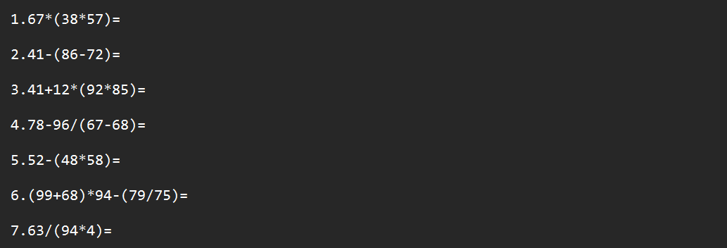 public String getProblem() { while (true) { problem = ""; int length = 0; int left = 0; int gap = 0;//length用于跟踪数学题目的长度,即题目中包含的操作符和数字的数量。left用于跟踪未关闭的左括号的数量。在代码中,当 left 的值大于0时,会尝试添加右括号来关闭它们。gap用于跟踪两个操作符之间的数字的数量。在代码中,当 gap 的值大于等于2时,会尝试添加右括号 int sym = 1;//这个变量用于控制生成的数学题目中符号(操作符)的数量1-5 int sym2 = r.nextInt(3) + 1;//初始化三角函数个数大于1的整数 int bracket = r.nextInt(3);//这个变量初始化了括号的数量。它从0到2之间随机生成一个数,表示在生成的数学题目中有多少个括号对。括号用于改变运算的优先级。 while (true) { if (r.nextInt(2) == 0 && bracket > 0) {//它的作用是控制是否在数学表达式中添加左括号 "(",有二分之一的概率加左括号 problem += "("; bracket--; left++; gap = 0; } gap++;//操作符间数字数量+1 int num = r.nextInt(100) + 1; if (r.nextInt(3) == 0) {//1/3的概率加入平方根号 if (r.nextInt(2) == 0) { problem += (String.valueOf(num) + symbol[4]);//这里是加平方的 } else { problem += (symbol[5] + String.valueOf(num));//这里是加√的 } sym--; } else { if (r.nextInt(2) == 0) {//1/2的概率加入三角函数 int symloc = r.nextInt(3) + 6; problem += (symbol[symloc] + String.valueOf(num)); sym2--; } else {//1/2的概率加入普通数字 problem += String.valueOf(num); } } if (r.nextInt(2) == 0 && left > 0 && gap >= 2) { problem += ")"; left--; } if (length >= 2 && sym <= 0 && sym2 <= 0 && bracket <= 0 && left <= 0) { break; } problem += symbol[r.nextInt(4)];//那些+-* /是从这一句整出来的 length++; } if (length < 5 && gap < 5) { break; } } problem += "="; return problem; }