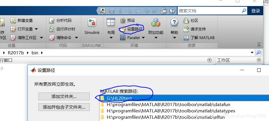 2、修改matlab默认路径,此处设置路径为:G:\HL20test