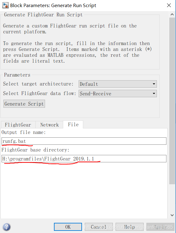 6、或者点击模型中的FlightGear模块,双击【GEN FG RUN】修改参数,生产运行脚本runfg.bat,双击G:\HL20test\slexamples\asbhl20\work中的runfg.bat运行FlightGear。(一定要在文件夹中双击运行,不在matlab程序中直接运行)