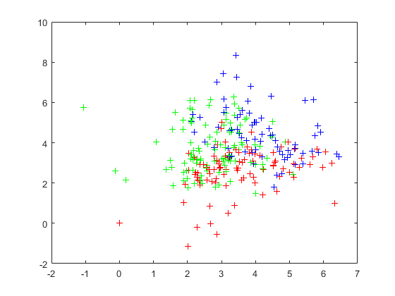 %% edit data visualization data_vis=dataset_edit; figure(2); for n=1:length(data_vis) X=data_vis(n,1); Y=data_vis(n,2); if data_vis(n,attribute_num+1)==1 color='red'; elseif data_vis(n,attribute_num+1)==2 color='green'; elseif data_vis(n,attribute_num+1)==3 color='blue'; end plot(X,Y,'+','Color',color); hold on; end