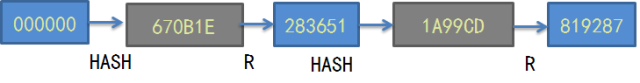 先对原始数据“000000”进行一次HASH运算得到“670B1E”,再对HASH值进行一次R运算,R是一个定制的算法可以将HASH值映射到明文空间上(这里我们的明文空间是000000~999999),R运算后得到“283651”,再对“283651”进行hash运算得到“1A99CD”,然后在进行R运算得到“819287”,如此重复多次,得到一条哈希链。然后再选用其它原始数据建立多条哈希链。最终仅将链头和链尾保存下来,中间节点全都去掉。