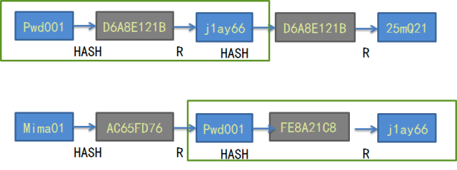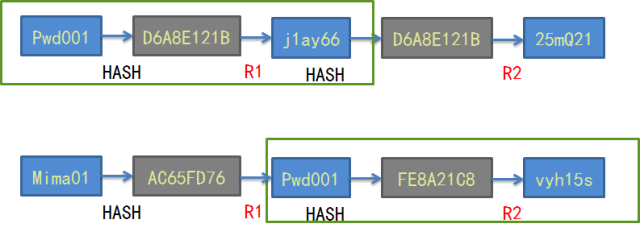 全表共100W条记录,因为数据量不大,这种情况建表、查表都非常容易。但是当密码并不是6位纯数字密码,而是数字、大小写字母结合的10位密码时,建立一个这样的表需要(26+26+10)^ 10 ≈ 83亿亿(条记录),存储在硬盘上至少要占用2000W TB的空间,这么大的存储空间,成本太大,几乎不可行。有什么办法可以减少存储空间?一种方法是“预计算哈希链”,“预计算哈希链”可以大幅减少HASH表的存储空间,但相应的增加了查表时的计算量,其原理大致如下: