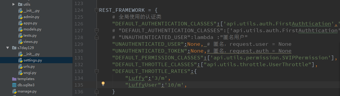 1 REST_FRAMEWORK = { 2 # 全局使用的认证类,列表形式,可以写多个,在视图里面应用 3 "DEFAULT_AUTHENTICATION_CLASSES":['api.utils.auth.FirstAuthtication','api.utils.auth.Authtication', ], 4 # "DEFAULT_AUTHENTICATION_CLASSES":['api.utils.auth.FirstAuthtication', ], 5 # "UNAUTHENTICATED_USER":lambda :"匿名用户" 6 "UNAUTHENTICATED_USER":None, # 匿名,request.user = None 7 "UNAUTHENTICATED_TOKEN":None,# 匿名,request.auth = None 8 #全局使用的权限类,可以写多个,视图里面应用 9 "DEFAULT_PERMISSION_CLASSES":['api.utils.permission.SVIPPermission'], 10 #全局使用的访问频率类,可以写多个,视图里面应用 11 "DEFAULT_THROTTLE_CLASSES":["api.utils.throttle.UserThrottle"], 12 "DEFAULT_THROTTLE_RATES":{ 13 "Luffy":'3/m', 14 "LuffyUser":'10/m', 15 } 16 }