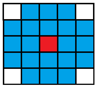 \(\bullet\) 对于每个点,我们从它向四周\(5×5\)的矩阵连一条费用为\(1\)的边,注意矩阵周围四个角不连。