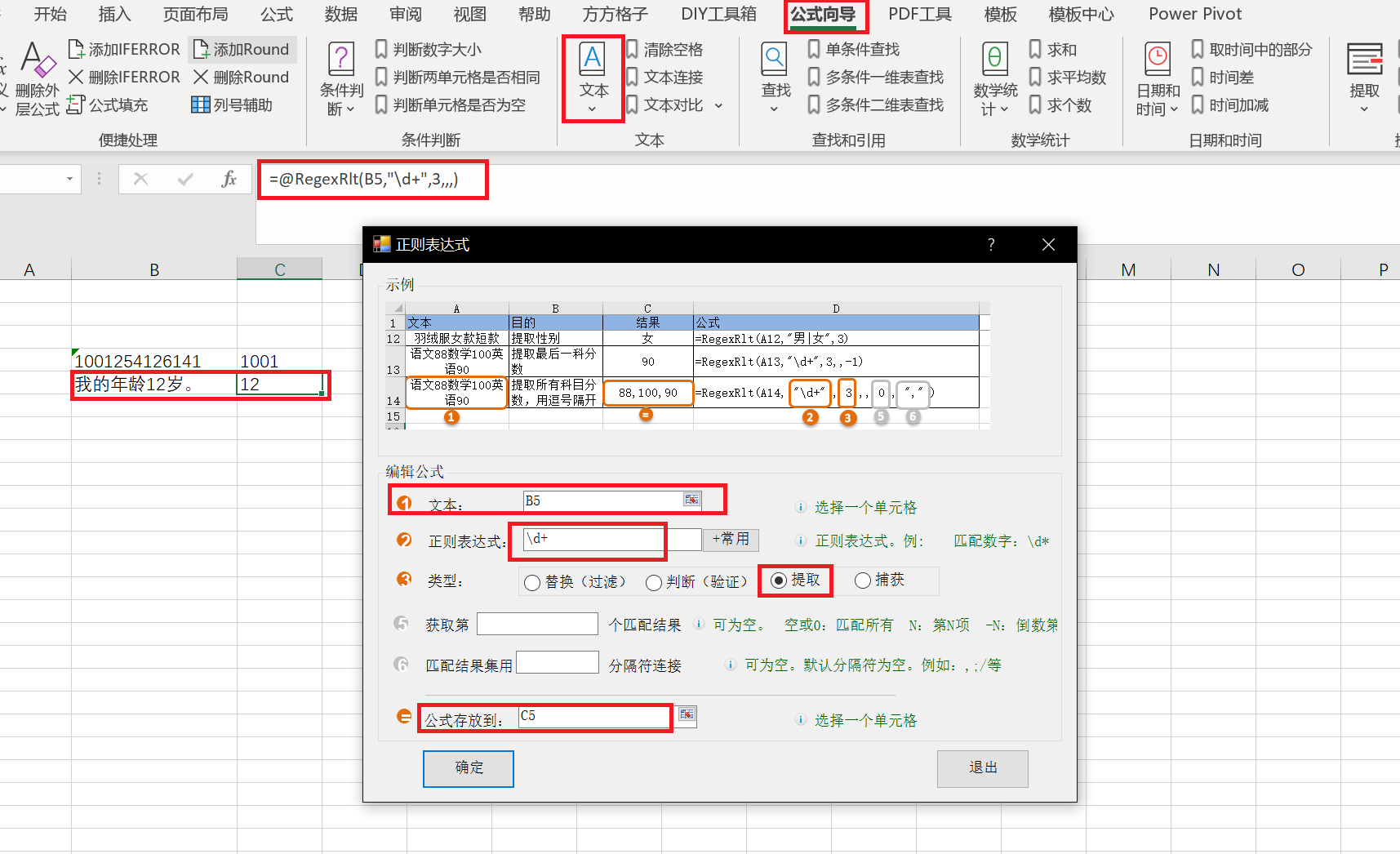 比如:在excel中想获得“我的年龄12岁。”这句话中数字12,用其它的方式感觉都比较困难获取,这里通过正则表达式就非常简单。公式为:@RegexRlt(B5,"\d+",3,,,)。