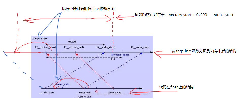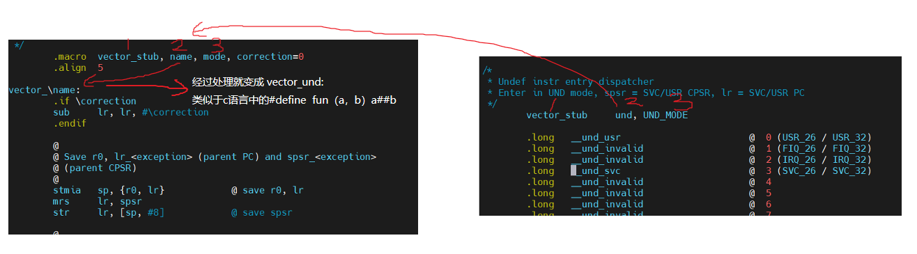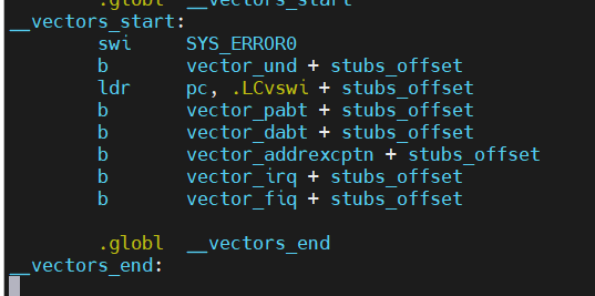 这个向量表被 arch/arm/kenerl/traps.c 中的 trap_init 函数拷贝到内存0xffff0000处,这个表中的跳转指令(例如 b vector_und + stubs_offset)会跳转到同文件中__stubs_start 到 __stubs_end 标签指定的代码段中的对应指令(很长就不截图了,总而言之是一段代码)。__stubs_start 到 __stubs_end所指示的这段代码被复制到 内存 0xffff0000 + 0x200 处(见trap_init函数),例如执行 b vector_und + stubs_offset 就能跳到 __stubs_start 到 __stubs_end 中 vector_und:处。