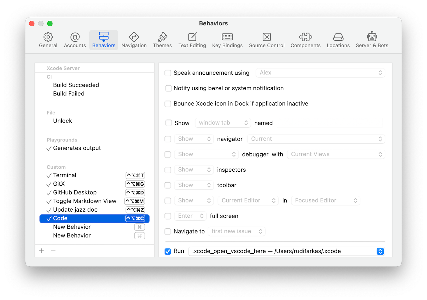- 在Xcode > Behaviors > Edit Behaviors…> Custom link the script to a keyboard shortcut,例如ctrl-shift-cmd-C