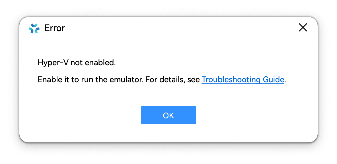 启动模拟器时,弹窗提示“未开启Hyper-V”或“Hyper-V not enabled”。