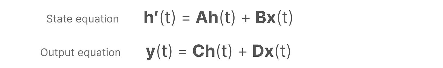 SSMs 假设动态系统,如 3D 空间中移动的物体,可以通过两个方程从其在时间 t 的状态进行预测。