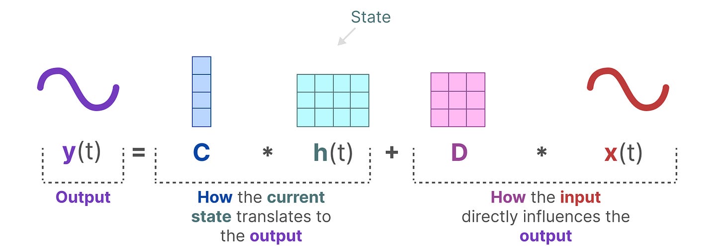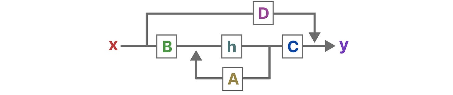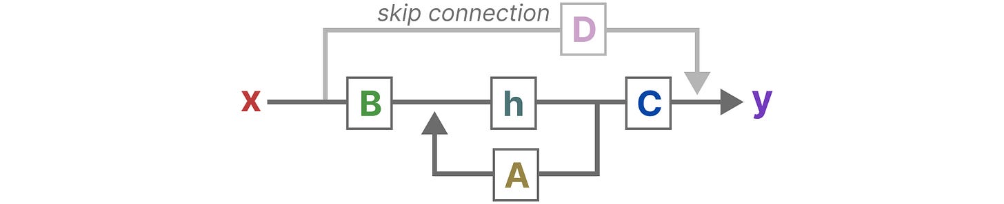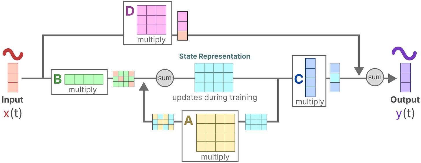 【注意:矩阵 A、B、C 和 D 也通常被称为参数,因为它们是可以学习的。】