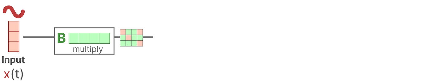 1、假设我们有一些输入信号x(t),这个信号首先被矩阵B乘以,