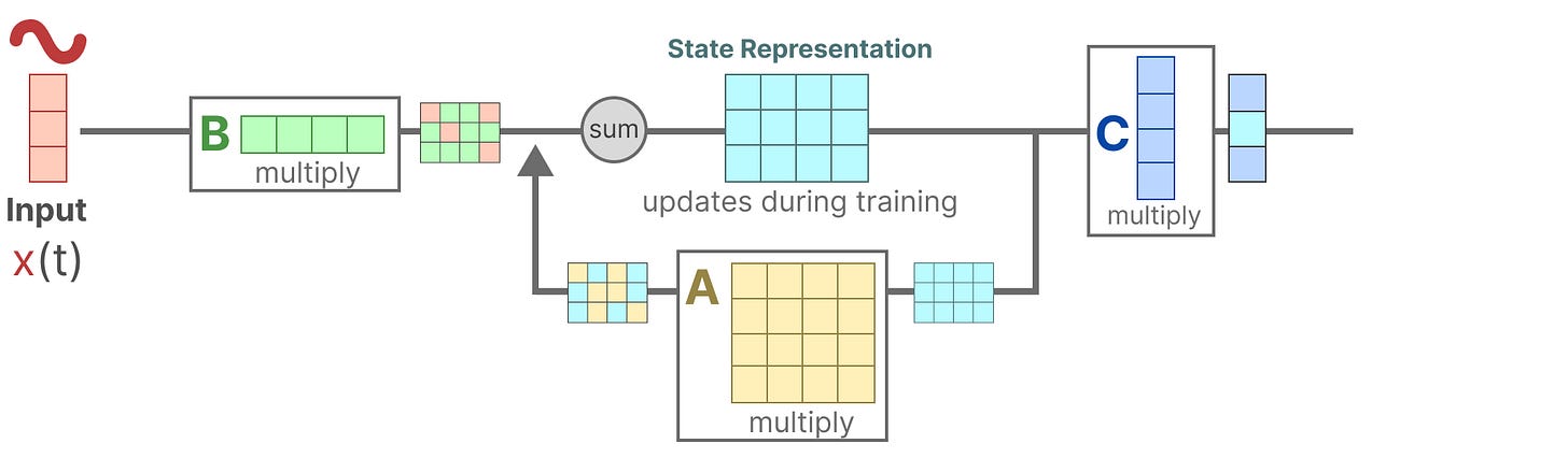 【注意:矩阵 A 保持不变,因为我们希望状态本身保持静态,但影响状态的方式(通过 B 和 C)是动态的。】