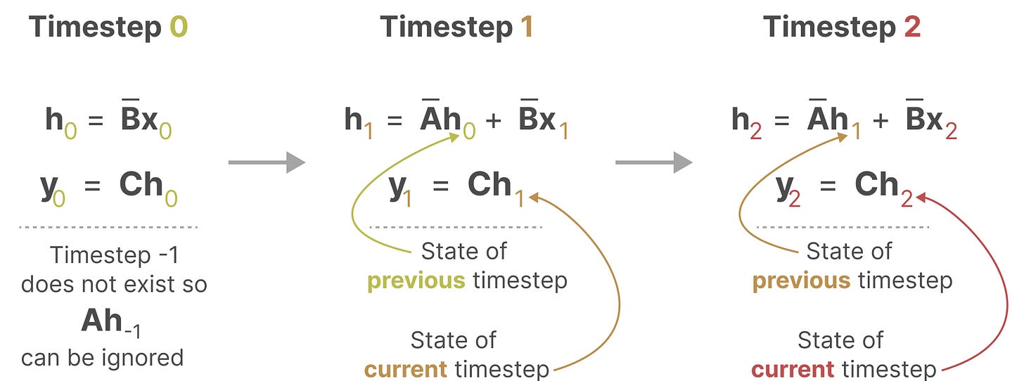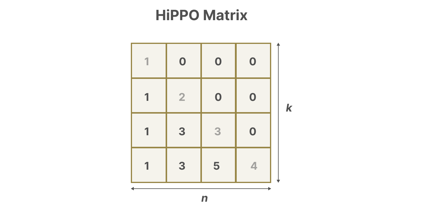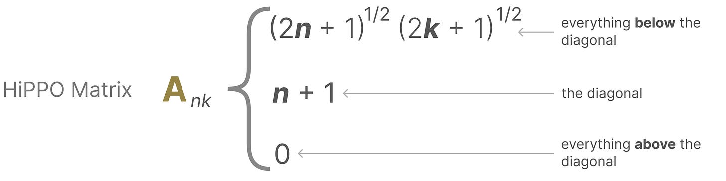 可以说,SSM 公式的最重要方面之一是矩阵 A。正如我们之前在递归表示中看到的那样,它捕捉了先前状态的信息来构建新状态。