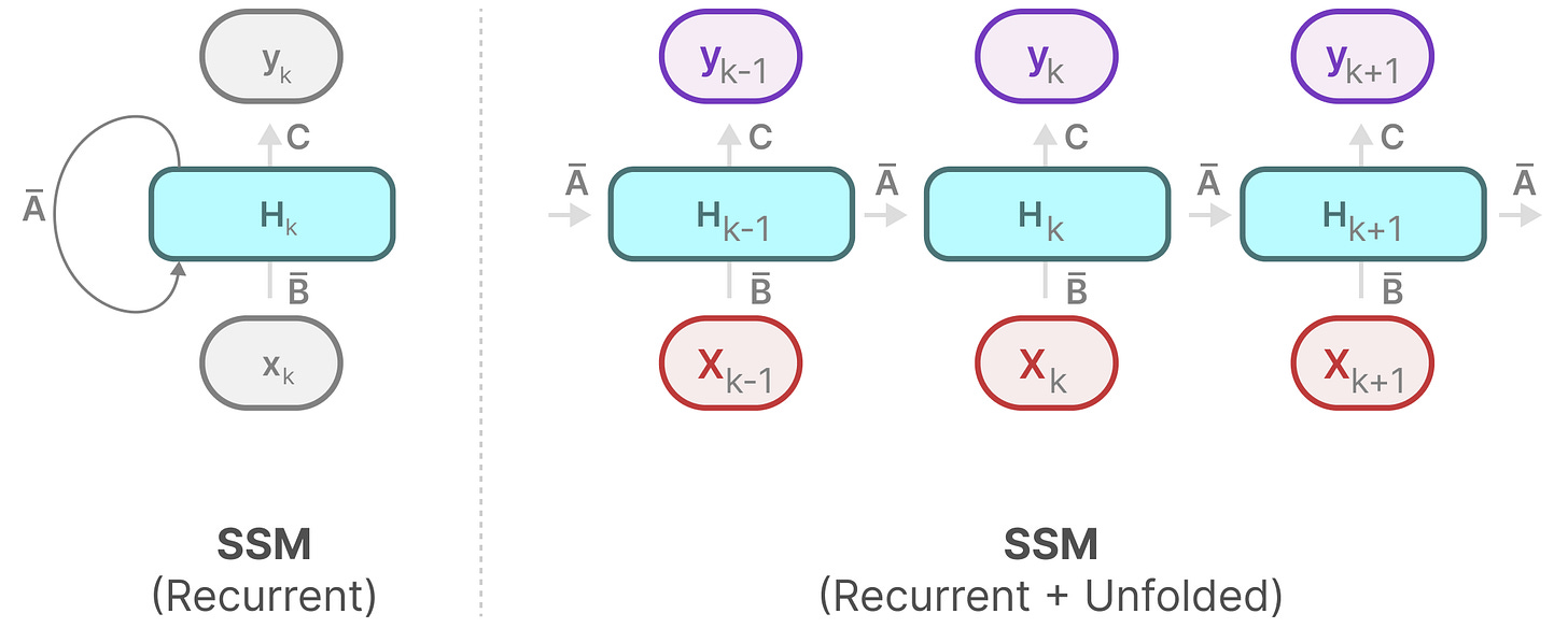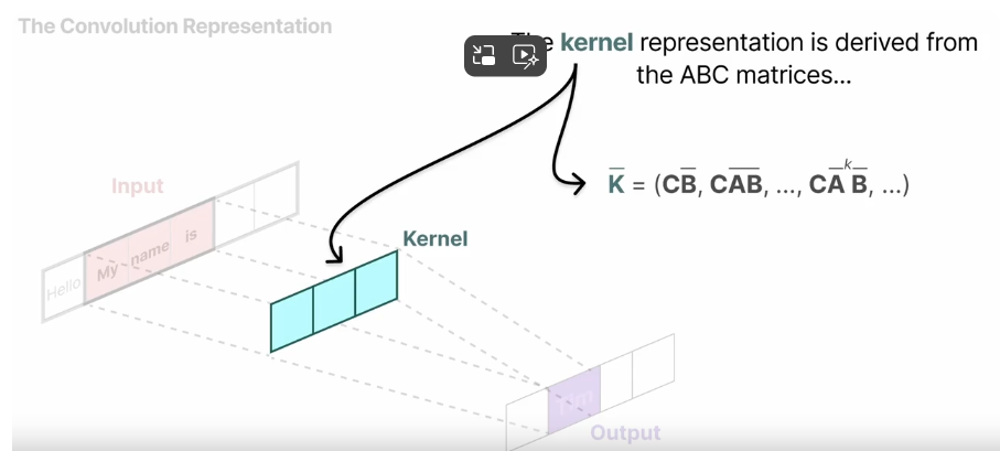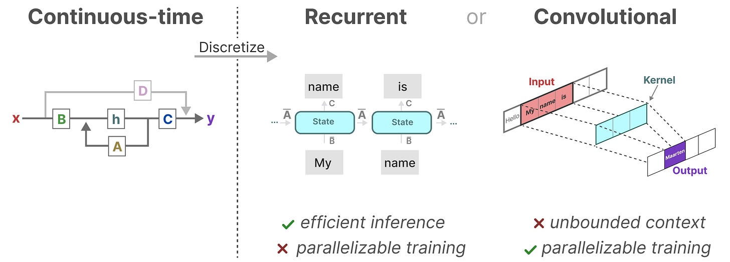 有趣的是,我们现在有了循环 SSM 的高效推理和卷积 SSM 的可并行训练。