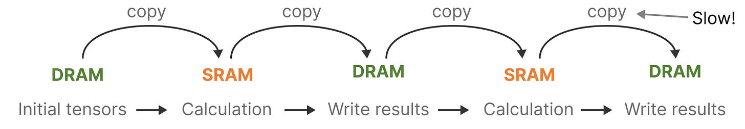 近年来 GPU 的一个缺点是它们在小型但高效的 SRAM 和大型但略低效的 DRAM 之间有限的传输(I/O)速度。频繁地在 SRAM 和 DRAM 之间复制信息成为瓶颈。