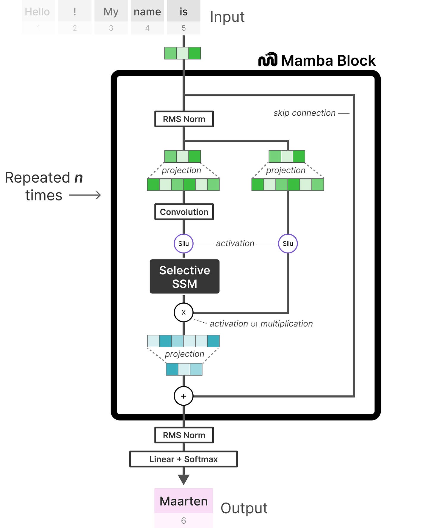 这种架构通常被称为选择性 SSM 或 S6 模型,因为它本质上是一个使用选择性扫描算法计算的 S4 模型。