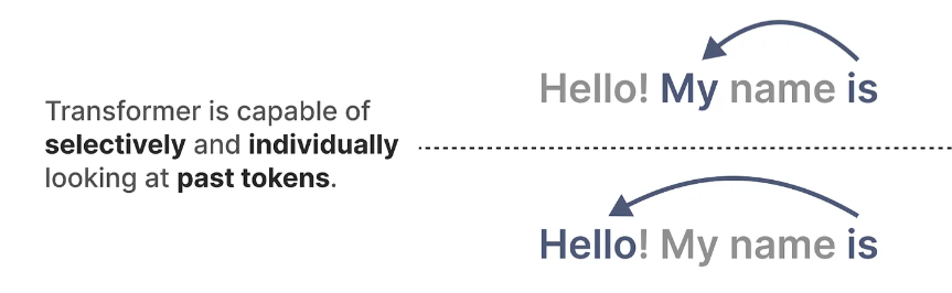 Transformer 的主要优势在于,无论它接收什么输入,它都可以回顾序列中的任何早期标记来推导其表示。(有选择地、单独地)