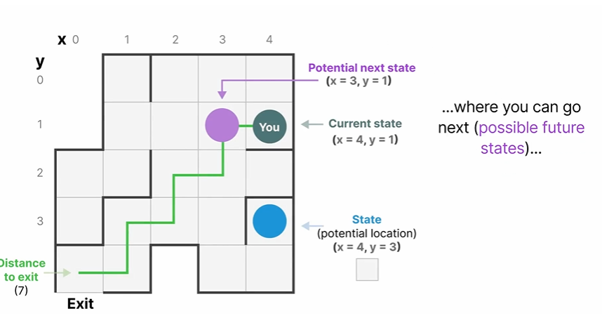 我们来简化一下,假设现在我们正在迷宫中导航,“状态空间”是所有可能位置(状态)的地图,每一个具体的位置点代表迷宫中的一个独特位置,具有特定的细节信息,比如你离出口还有多远。