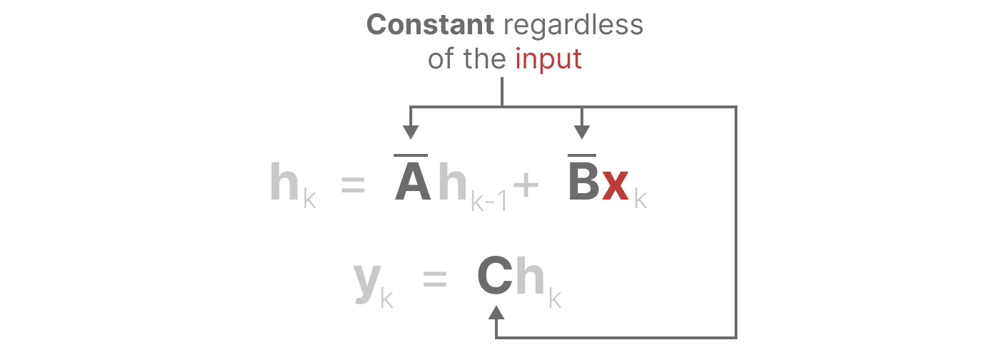 同样,A 和 C 也无论输入如何都保持不变。这证明了我们迄今为止所看到的 SSMs 的静态特性:
