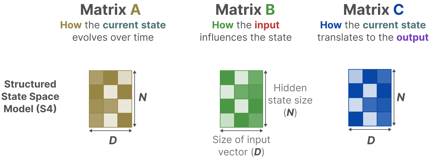 在结构化状态空间模型(S4)中,矩阵 A、B 和 C 与输入无关,因为它们的维度 N 和 D 是静态的,不会改变。