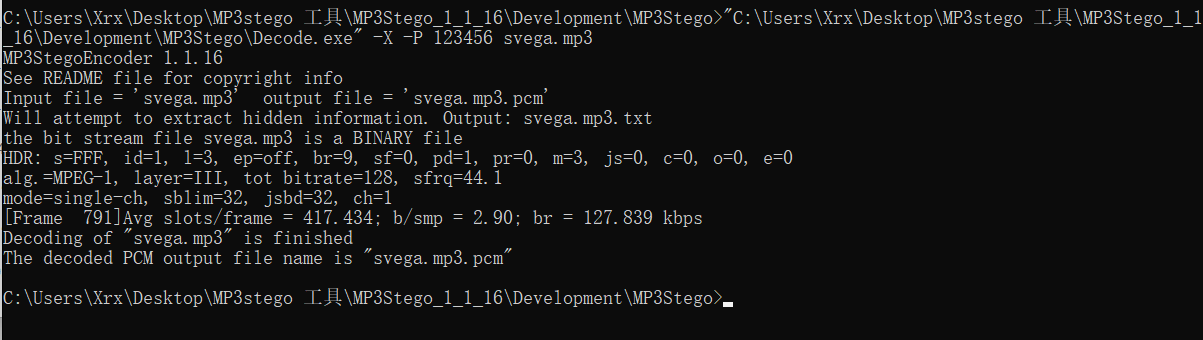 在MP3stego的目录下打开cmd,将Decode.exe拖入cmd命令行中